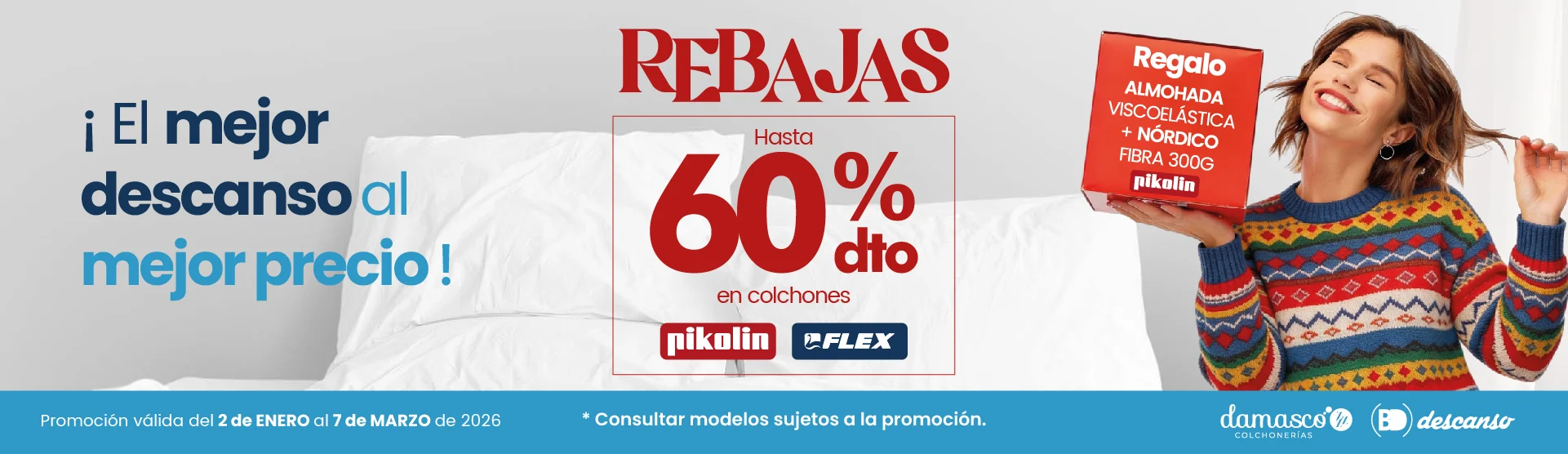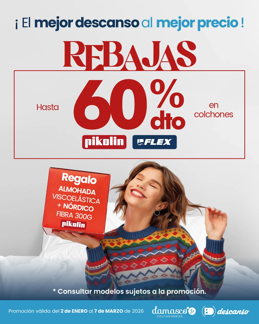 Aprovecha esta oportunidad para renovar tu descanso con las mejores marcas y materiales (viscoelástica, muelles ensacados, látex, etc.) a precios mucho más bajos, con la misma y garantía.